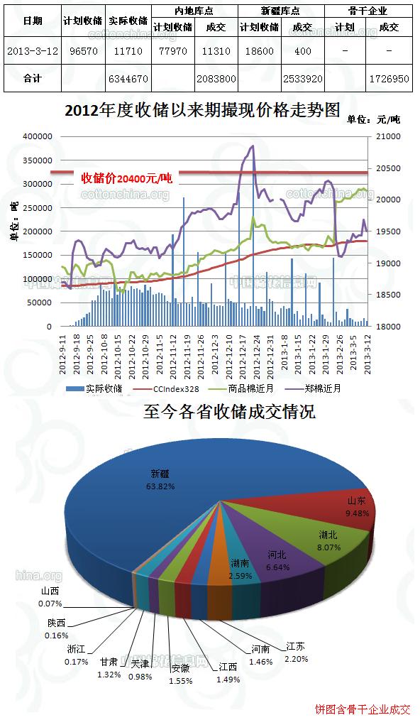 截至今日2012年度棉花臨時收儲累計成交6344670噸,新疆累計成交2533920噸,內(nèi)地累計成交2083800噸,骨干企業(yè)共累計成交1726950噸。
