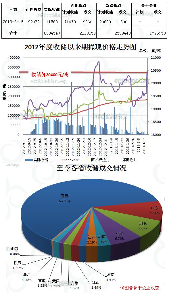 3月15日,計(jì)劃收儲(chǔ)92070噸,實(shí)際成交11560噸,成交比例12.6%,較前一天減少530噸。其中新疆庫點(diǎn)計(jì)劃收儲(chǔ)20600噸,實(shí)際成交1600噸,成交比例7.8%;內(nèi)地庫計(jì)劃收儲(chǔ)71470噸,實(shí)際成交9960噸,成交比例13.9%。