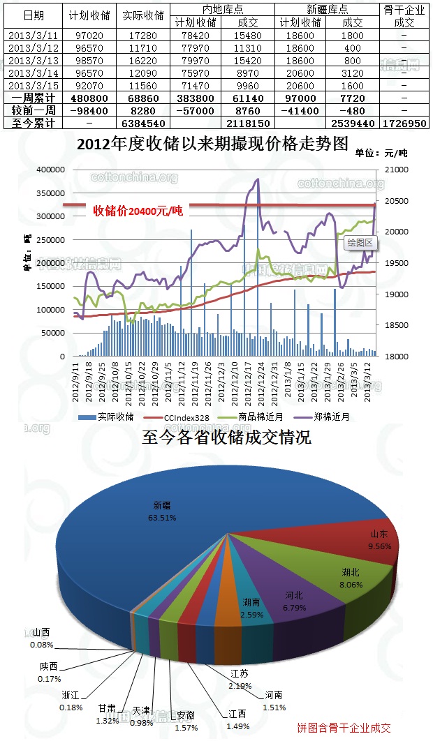上周(3.11-3.15)共計(jì)劃收儲(chǔ)480800噸,實(shí)際成交68860噸,周成交比例14.32%;其中內(nèi)地共計(jì)劃收儲(chǔ)383800噸,實(shí)際成交61140噸,較前一周增加8760噸,周成交比例15.9%;新疆共計(jì)劃收儲(chǔ)97000噸,實(shí)際成交7720噸,較前一周減少480噸,周成交比例7.96%。