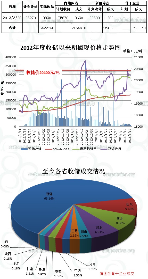 截至今日2012年度棉花臨時(shí)收儲(chǔ)累計(jì)成交6422740噸,新疆累計(jì)成交2541280噸,內(nèi)地累計(jì)成交2154510噸,骨干企業(yè)共累計(jì)成交1726950噸。