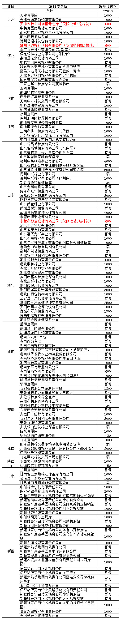 定于3月29日在以下指定倉庫收儲2012年度棉花97070噸。哈密雙銀棉業(yè)有限責(zé)任公司僅限東疆棉花企業(yè)競拍,新疆維吾爾自治區(qū)棉麻公司博樂棉麻站僅限于博樂地區(qū)棉花企業(yè)競拍,以上庫點其他地區(qū)企業(yè)競拍將按違約處理。