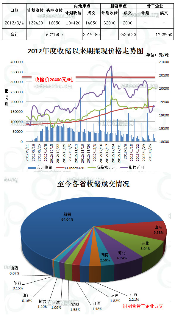 截至今日2012年度棉花臨時收儲累計成交6271950噸,新疆累計成交2525520噸,內(nèi)地累計成交2019480噸,骨干企業(yè)共累計成交1726950噸。