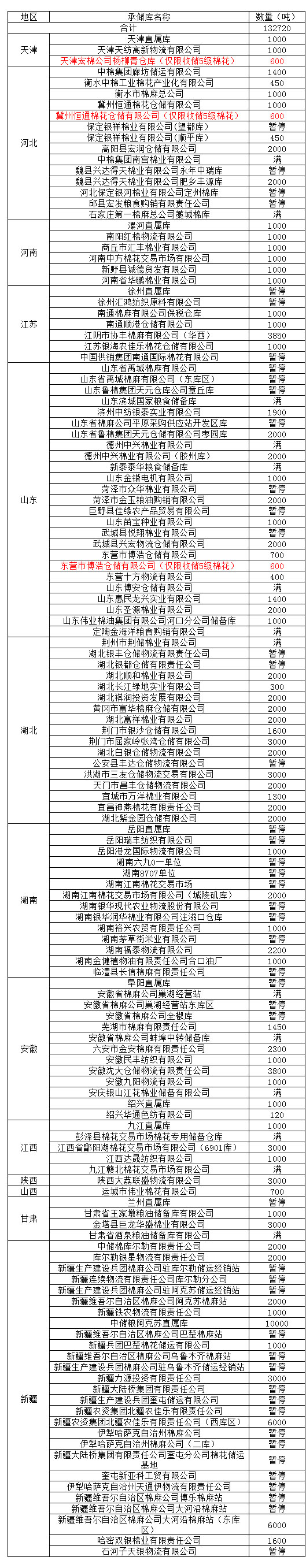 定于3月5日在以下指定倉庫收儲(chǔ)2012年度棉花132720噸。哈密雙銀棉業(yè)有限責(zé)任公司僅限東疆棉花企業(yè)競拍,新疆維吾爾自治區(qū)棉麻公司博樂棉麻站僅限于博樂地區(qū)棉花企業(yè)競拍,以上庫點(diǎn)其他地區(qū)企業(yè)競拍將按違約處理。