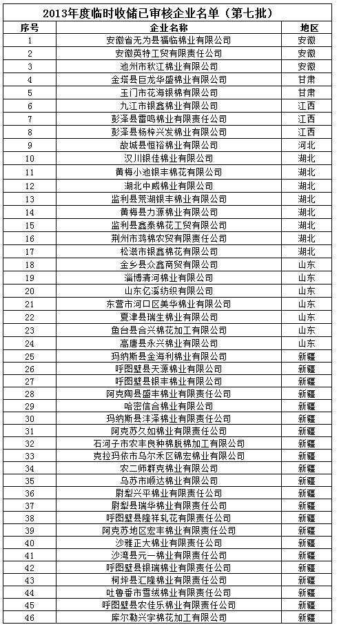 2013年度棉花臨時(shí)收儲(chǔ)已審核企業(yè)名單(第七批)