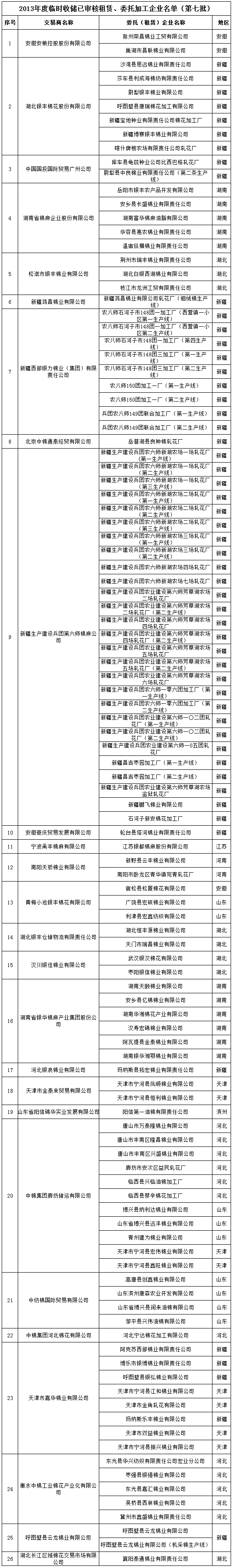 2013年度棉花臨時收儲已審核租賃、委托加工企業(yè)名單(第七批)