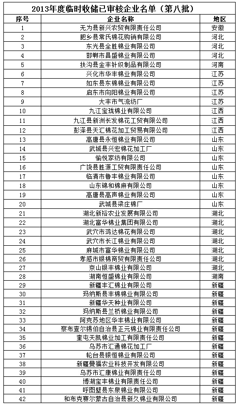 2013年度棉花臨時收儲已審核企業(yè)名單(第八批)