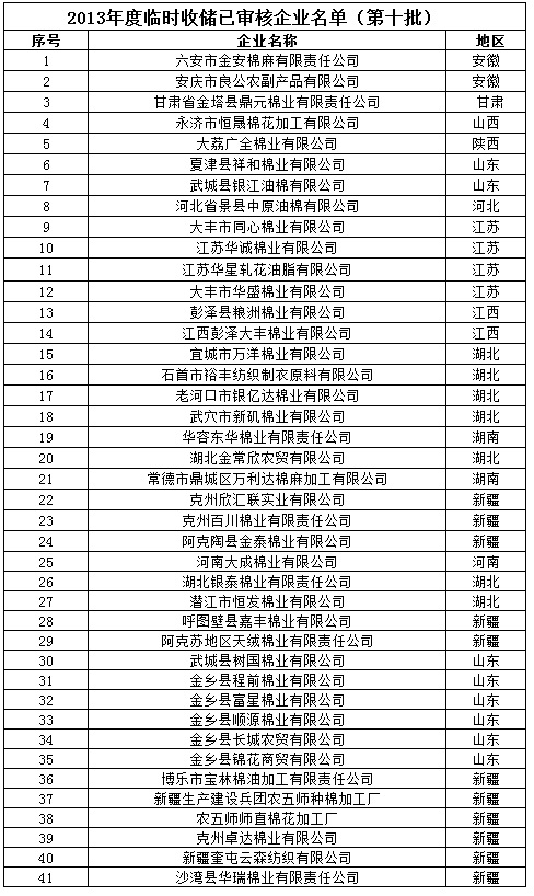 2013年度棉花臨時(shí)收儲(chǔ)已審核企業(yè)名單(第十批)