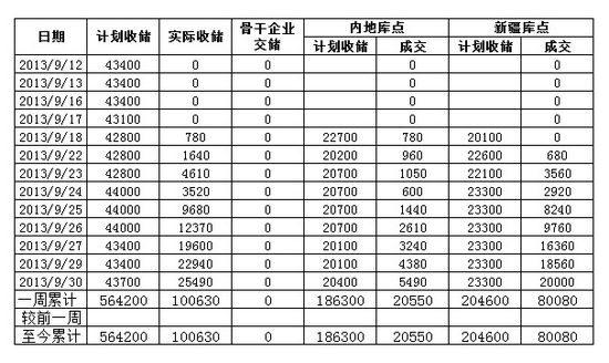 9月18日至30日共計劃收儲564200噸,實際成交100630噸,周成交比例18%;其中內(nèi)地共計劃收儲186300噸,實際成交20550噸,周成交比例11%;新疆共計劃收儲204600噸,實際成交80080噸,周成交比例39%。
