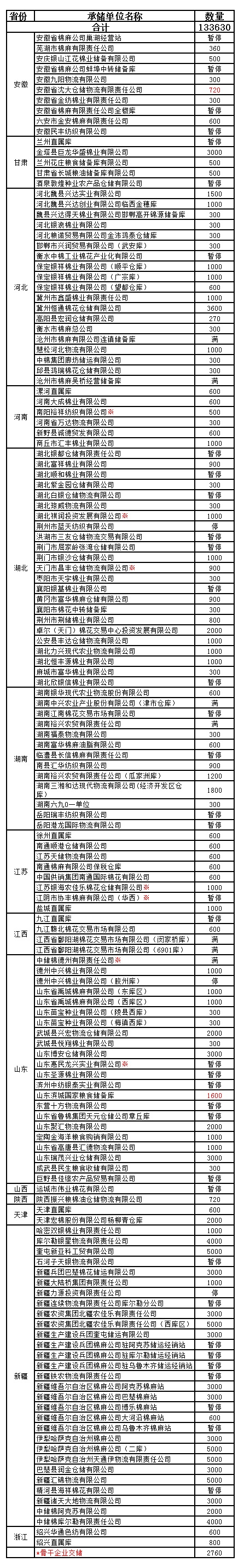 各涉棉企業(yè): 1月14日在以下指定倉庫收儲2013年度棉花133630噸(含骨干企業(yè)交儲棉花2760噸)。 為了滿足新疆企業(yè)交儲需要,緩解新疆地區(qū)入庫壓力,在不影響內(nèi)地就近交儲的前提下,以下帶“※”庫點(diǎn)作為內(nèi)地接收新疆棉花交儲的指定庫點(diǎn)。