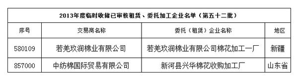2013年度棉花臨時(shí)收儲(chǔ)已審核租賃、委托加工企業(yè)名單(第五十二批)