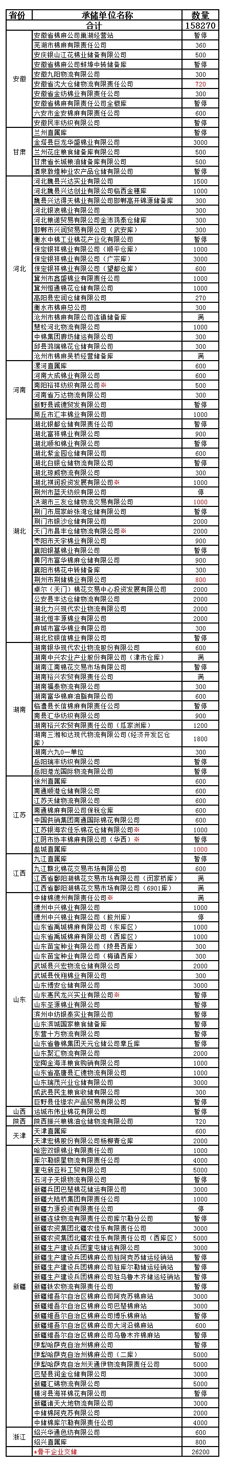 各涉棉企業(yè): 1月17日在以下指定倉庫收儲2013年度棉花158270噸(含骨干企業(yè)交儲棉花26200噸)。 為了滿足新疆企業(yè)交儲需要,緩解新疆地區(qū)入庫壓力,在不影響內(nèi)地就近交儲的前提下,以下帶“※”庫點作為內(nèi)地接收新疆棉花交儲的指定庫點。