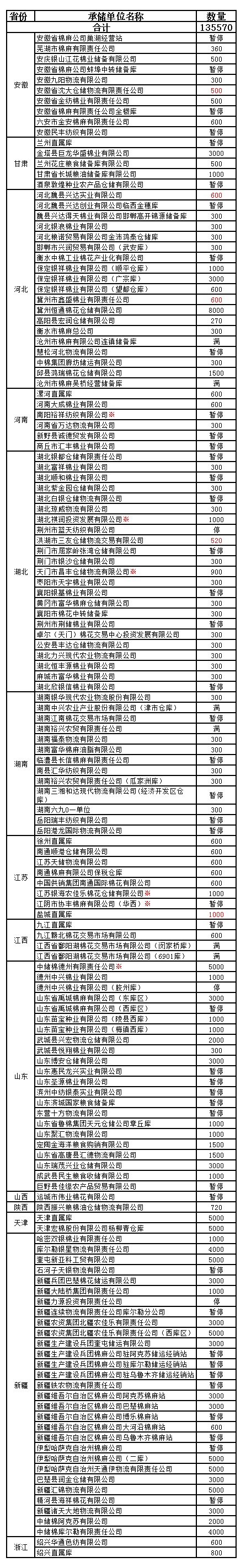 為了滿足新疆企業(yè)交儲需要,緩解新疆地區(qū)入庫壓力,在不影響內(nèi)地就近交儲的前提下,以下帶“※”庫點(diǎn)作為內(nèi)地接收新疆棉花交儲的指定庫點(diǎn)。