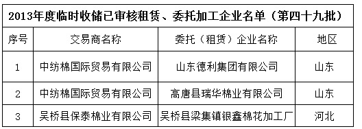 2013年度棉花臨時收儲已審核租賃、委托加工企業(yè)名單(第四十九批)