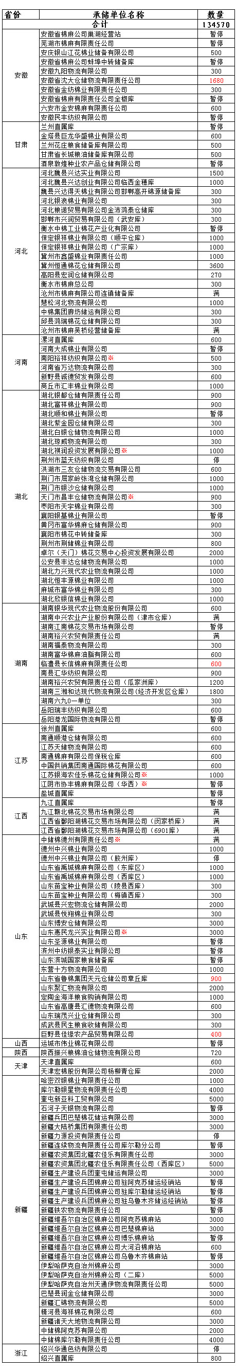 各涉棉企業(yè): 1月8日在以下指定倉庫收儲2013年度棉花134570噸。 為了滿足新疆企業(yè)交儲需要,緩解新疆地區(qū)入庫壓力,在不影響內(nèi)地就近交儲的前提下,以下帶“※”庫點作為內(nèi)地接收新疆棉花交儲的指定庫點。
