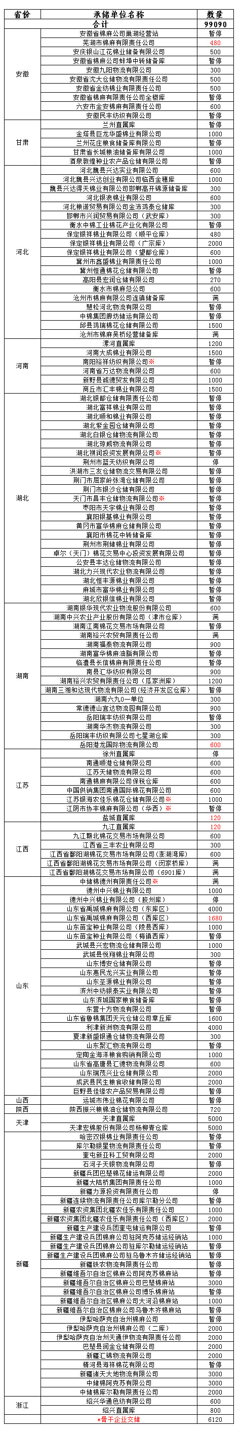 各涉棉企業(yè): 3月14日在以下指定倉庫收儲(chǔ)2013年度棉花99090噸(含骨干企業(yè)交儲(chǔ)棉花6120噸)。 為了滿足新疆企業(yè)交儲(chǔ)需要,緩解新疆地區(qū)入庫壓力,在不影響內(nèi)地就近交儲(chǔ)的前提下,以下帶“※”庫點(diǎn)作為內(nèi)地接收新疆棉花交儲(chǔ)的指定庫點(diǎn)。