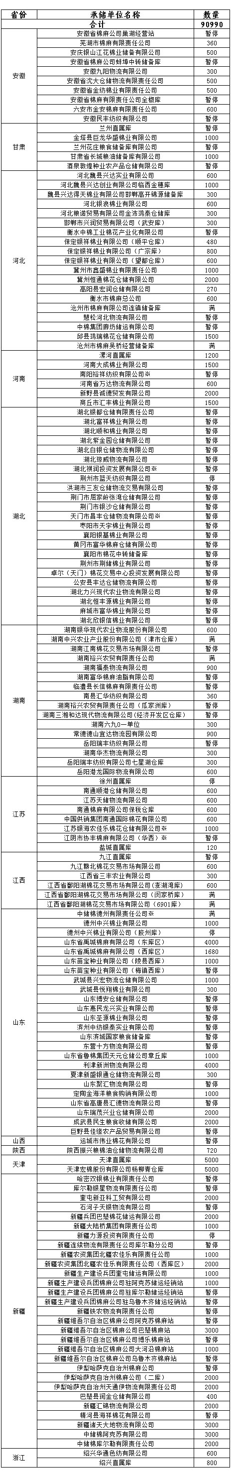 各涉棉企業(yè): 3月24日在以下指定倉庫收儲2013年度棉花90990噸。 為了滿足新疆企業(yè)交儲需要,緩解新疆地區(qū)入庫壓力,在不影響內地就近交儲的前提下,以下帶“※”庫點作為內地接收新疆棉花交儲的指定庫點。