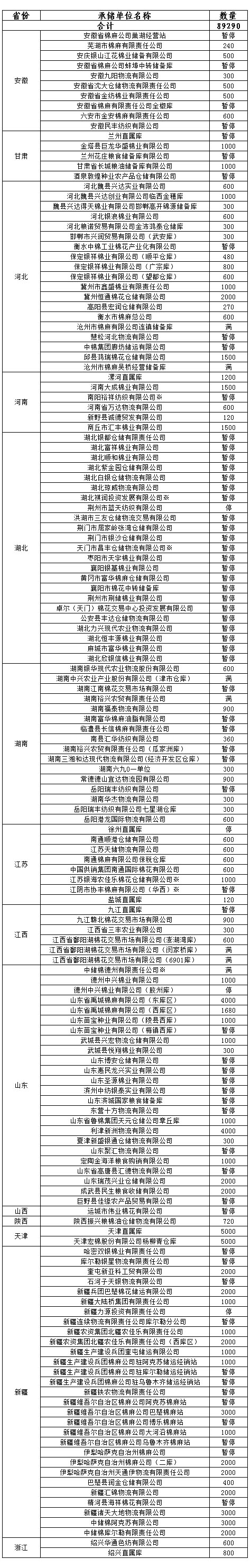 為了滿足新疆企業(yè)交儲(chǔ)需要,緩解新疆地區(qū)入庫壓力,在不影響內(nèi)地就近交儲(chǔ)的前提下,以下帶“※”庫點(diǎn)作為內(nèi)地接收新疆棉花交儲(chǔ)的指定庫點(diǎn)。