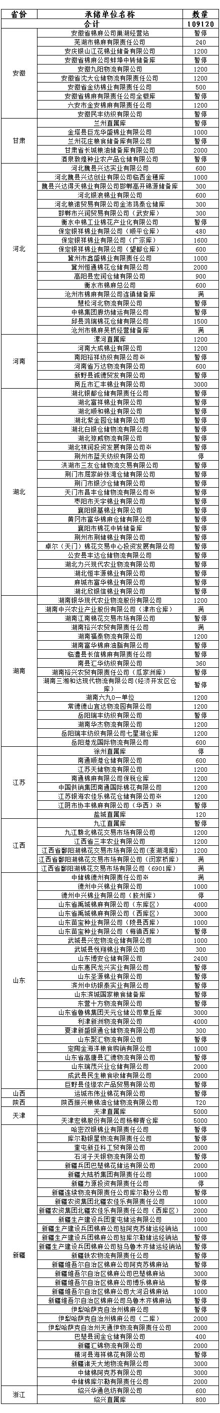 各涉棉企業(yè): 3月31日在以下指定倉(cāng)庫(kù)收儲(chǔ)2013年度棉花109120噸。 為了滿足新疆企業(yè)交儲(chǔ)需要,緩解新疆地區(qū)入庫(kù)壓力,在不影響內(nèi)地就近交儲(chǔ)的前提下,以下帶“※”庫(kù)點(diǎn)作為內(nèi)地接收新疆棉花交儲(chǔ)的指定庫(kù)點(diǎn)。
