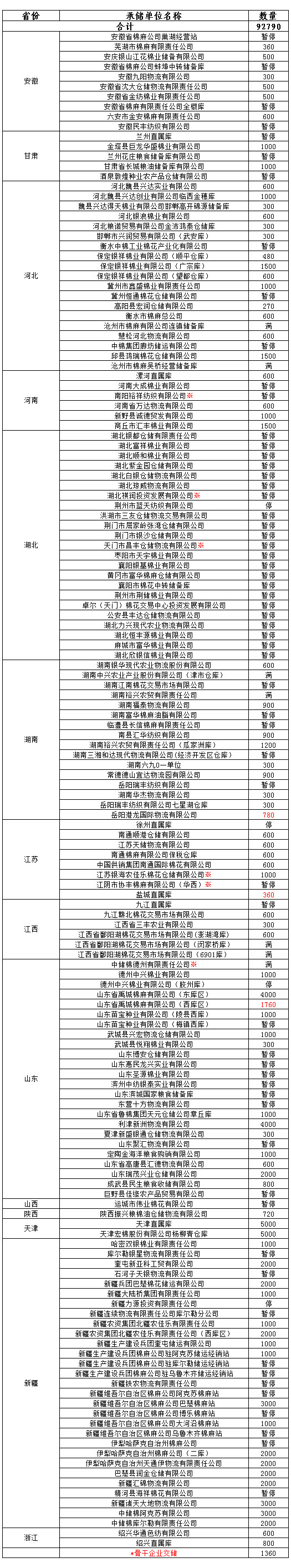 各涉棉企業(yè): 3月4日在以下指定倉庫收儲2013年度棉花92790噸(含骨干企業(yè)交儲棉花1360噸)。 為了滿足新疆企業(yè)交儲需要,緩解新疆地區(qū)入庫壓力,在不影響內(nèi)地就近交儲的前提下,以下帶“※”庫點(diǎn)作為內(nèi)地接收新疆棉花交儲的指定庫點(diǎn)。