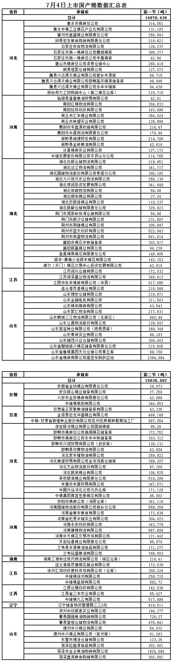 7月4日兩節(jié)共計輪出儲備棉30008.841噸。第一節(jié)計劃輪出儲備棉14970.439噸,其中國產(chǎn)棉14970.439噸、進(jìn)口棉0噸。第二節(jié)計劃輪出儲備棉15038.402噸,其中國產(chǎn)棉15038.402噸、進(jìn)口棉0噸。