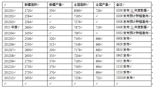 針對(duì)產(chǎn)量綜合分析,新疆種植面積變化巨大,自2012年4月預(yù)計(jì)2450萬(wàn)畝,后來(lái)逐月增加至2012年12月10日公布2750萬(wàn)畝,產(chǎn)量370萬(wàn)噸(新疆棉花收購(gòu)已經(jīng)95%比例),尤其2013年1月9日公布面積2950萬(wàn)畝,產(chǎn)量410萬(wàn)噸。比上個(gè)月面積一下子增加200萬(wàn)畝,產(chǎn)量增加40萬(wàn)噸,超乎預(yù)期和想象(不排除人為或其他因素)。(為做最壞打算,以下計(jì)算均按照預(yù)估的產(chǎn)量計(jì)算)