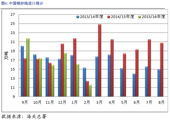 隨著我國棉花的低價(jià)輪出,國內(nèi)的中小企業(yè)的紡紗成本也降低了,國產(chǎn)棉紗的優(yōu)勢(shì)也將顯現(xiàn),我國也會(huì)逐步將進(jìn)口棉紗阻擋在國門以外,因此預(yù)計(jì)后期進(jìn)口棉紗量同比將大幅減少,預(yù)計(jì)2015年我國進(jìn)口棉紗量將減少到150-180萬噸,減少的進(jìn)口棉紗將增加我國棉花60-90萬噸的棉花消費(fèi)量。