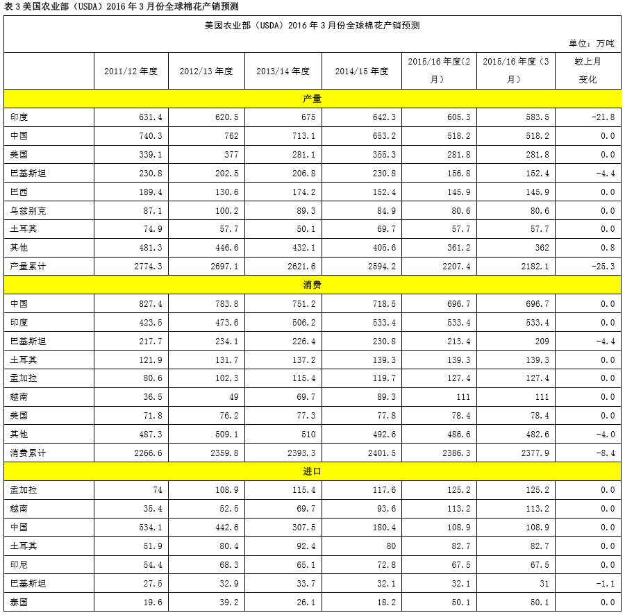 根據(jù)美國農(nóng)業(yè)部的3月份全球產(chǎn)需預(yù)測(cè),2015/16年度全球棉花除了印度外,其他國家產(chǎn)量和消費(fèi)變化不大。印度市場(chǎng)主要下調(diào)棉花產(chǎn)量。