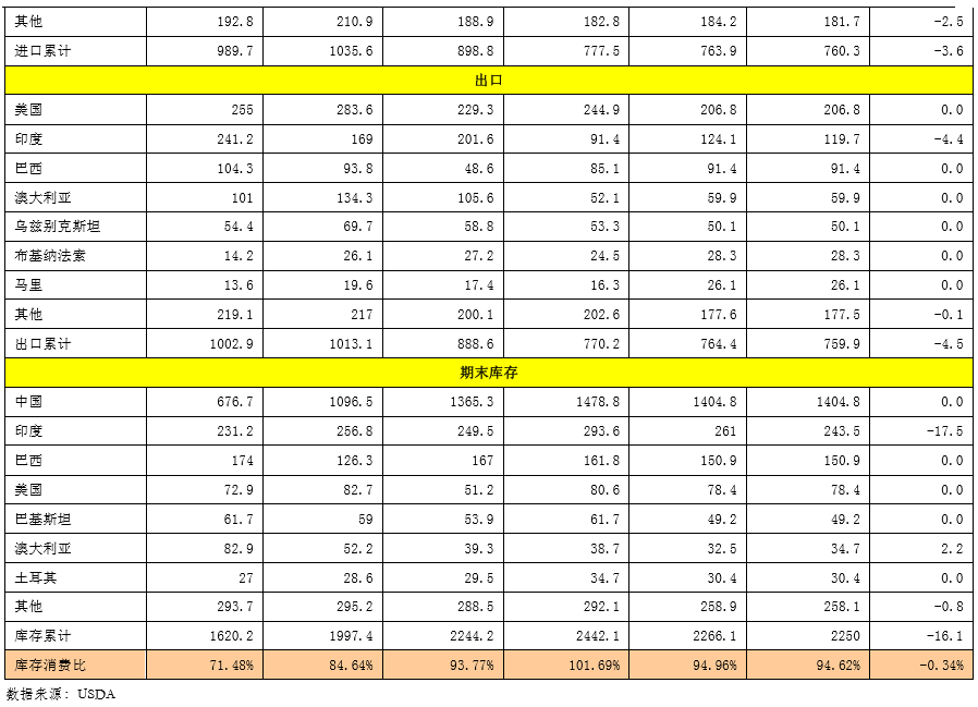 全球方面,2015/16年度:印度棉產(chǎn)量下調(diào)21.8萬噸至583.5萬噸,巴基斯坦棉產(chǎn)量下調(diào)4.4萬噸至152.4萬噸,全球棉產(chǎn)量下調(diào)25.3萬噸至2182.1萬噸。巴基斯坦用棉量下調(diào)4.4萬噸至209萬噸,全球用棉量下調(diào)8.4萬噸至2377.9萬噸。全球進(jìn)口棉量變化不大。印度出口棉量下調(diào)4.4至119.7萬噸。印度棉花庫存下調(diào)17.5萬噸至243.5萬噸,全球庫存下調(diào)16.1萬噸至2250萬噸。本次報(bào)告主要下調(diào)印度棉花產(chǎn)量和庫存,全球棉花產(chǎn)量和庫存也隨之下調(diào),對(duì)國際市場(chǎng)的影響略為偏多。