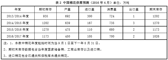 2016年國家繼續(xù)在新疆實(shí)施棉花目標(biāo)價(jià)格改革試點(diǎn)。綜合考慮棉花市場(chǎng)供求、生產(chǎn)成本收益等因素,經(jīng)國務(wù)院批準(zhǔn),國家發(fā)展改革委發(fā)布2016年新疆棉花目標(biāo)價(jià)格水平為每噸18600元。回顧自從2014年新疆棉花目標(biāo)價(jià)格改革試點(diǎn)工作啟動(dòng)的第一年,新疆棉花目標(biāo)價(jià)格水平為每噸19800元,發(fā)布時(shí)間為2014年4月5日;2015年新疆棉花目標(biāo)價(jià)格水平為每噸19100元,下調(diào)700元/噸,發(fā)布時(shí)間為2015年4月7日;2016年新疆棉花目標(biāo)價(jià)格水平繼續(xù)下調(diào)500元/噸,降幅較2015年縮小,發(fā)布時(shí)間大大提前(3月18日),利于棉農(nóng)合理安排春播事宜,也增加了棉農(nóng)的植棉信心??v觀這三年來的棉花直補(bǔ)政策,今年的目標(biāo)價(jià)格水平基本符合預(yù)期,甚至要高于預(yù)期,可見國家對(duì)于新疆的棉農(nóng)保護(hù)力度仍然很大,新疆的維持穩(wěn)定非常重要。對(duì)于新疆2016年的新疆植棉面積這一塊兒,雖說新疆自治區(qū)仍然以減少種植面積為目標(biāo),且從調(diào)查結(jié)果來看有減少,但是由于新疆的農(nóng)作物里面,棉花的補(bǔ)貼力度要遠(yuǎn)高于其他作物,能夠?qū)崒?shí)在在保證農(nóng)民收入,因此2016年新疆的植棉面積預(yù)計(jì)真實(shí)的減少幅度也不會(huì)特別大。假如2016年天氣情況較好,不會(huì)出現(xiàn)像2015年那樣的持續(xù)高溫天氣,預(yù)計(jì)2016年新疆棉的產(chǎn)量將維持或者微幅減少。