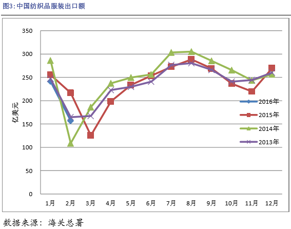 外需疲軟、中國競(jìng)爭(zhēng)優(yōu)勢(shì)弱化等原因依然是導(dǎo)致我國2月份紡織品服裝出口同比減少的主要原因。據(jù)海關(guān)統(tǒng)計(jì),2016年2月我國紡織品及服裝出口156.58億美元,環(huán)比減少35.11%,同比減少27.76%。其中紡織紗線及織物制品出口60.83億美元,環(huán)比減少35.63%,同比減少27.56%;服裝出口95.75億美元,環(huán)比減少34.78%,同比減少27.89%。2016年前兩個(gè)月我國紡織品及服裝出口共397.89億美元,同比減少15.73%。