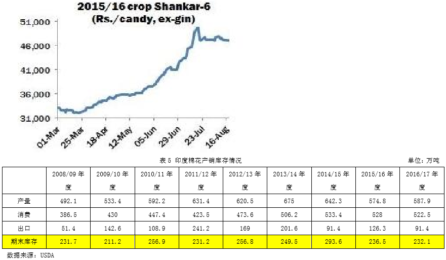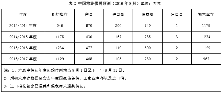 1、全球棉花庫存繼續(xù)減少,中、印庫存減幅大8月公布的2016/17年度平衡表環(huán)比變化:印度棉產(chǎn)量下調(diào)10.8萬噸至587.9萬噸,中國棉花產(chǎn)量下調(diào)10.9萬噸至457.2萬噸,美棉產(chǎn)量上調(diào)1.7萬噸至345.7萬噸,全球棉產(chǎn)量下調(diào)21萬噸至2211.7萬噸。越南用棉量下調(diào)4.4萬噸至102.3萬噸,全球用棉量下調(diào)7.2萬噸至2422.5萬噸。越南進(jìn)口棉量下調(diào)4.4萬噸至104.5萬噸。巴西出口棉量下調(diào)8.7至78.4萬噸。中國棉花庫存大幅下調(diào)21.7萬噸至1103.8萬噸,印度棉花庫存下調(diào)16.9至232.1萬噸,全球庫存大幅下調(diào)36.5萬噸至1951.1萬噸。本次報(bào)告主要下調(diào)印度棉和中國棉產(chǎn)量,大幅下調(diào)中國、印度和全球棉花庫存。