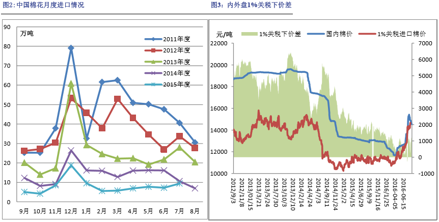 隨著內(nèi)外棉價(jià)差的減小以及儲(chǔ)備棉中將近30萬噸進(jìn)口棉的拍賣,2016年以來,我國進(jìn)口棉量大幅減少。據(jù)海關(guān)統(tǒng)計(jì),2016年7月我國進(jìn)口棉花9.5萬噸,環(huán)比31%,同比減少10%。2015/16年度(2015年9月-2016年7月),我國累計(jì)進(jìn)口棉花89萬噸,同比減少70萬噸,減幅44%;2016年1-7月累計(jì)進(jìn)口52.5萬噸,同比減少52.7萬噸,減幅51%。但是本月棉花進(jìn)口量較前幾個(gè)月略有回升,跟7月份我國國內(nèi)棉花價(jià)格大漲有較大關(guān)系。8月份以來,隨著ICE期棉價(jià)格的大跌,港口進(jìn)口棉價(jià)格也有所下降,目前美棉EMOTSM級(jí)棉花報(bào)價(jià)在80美分/磅,澳棉SM級(jí)報(bào)價(jià)在84.55美分/磅。近期港口保稅區(qū)棉花仍以澳棉為主,近期入庫棉花量不大。