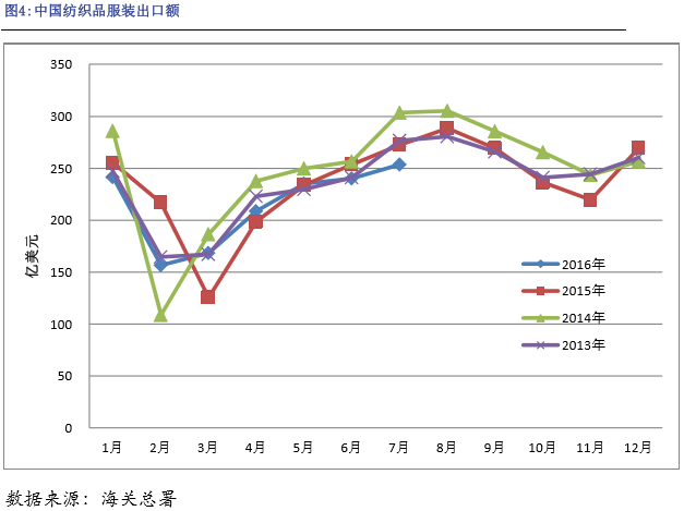由于國際經(jīng)濟(jì)環(huán)境不佳,且我國國內(nèi)經(jīng)濟(jì)下行壓力不減,人工成本居高不下,我國外貿(mào)情況整體較差,同樣作為我國主要出口產(chǎn)品之一的紡織品服裝出口形勢(shì)也面臨較大壓力。2016年1-7月,我國累計(jì)出口紡織品服裝1504.04億美元,同比減少3.37%,其中出口紡織物615.68億美元,同比減少1.40%;出口服裝888.36億美元,同比減少4.70%。7月份我國紡織品服裝出口金額延續(xù)之前的下滑之勢(shì),7月份我國出口紡織品服裝約253.74億美元,同比減少6.89%,其中出口紡織紗線、織物及制品91.26億美元,同比減少4.09%;出口服裝及衣著附件162.48億美元,同比減少8.4%。但是隨著紡織市場旺季的來臨,預(yù)計(jì)下個(gè)月紡織品服裝的出口數(shù)量相比本月將有所好轉(zhuǎn)。