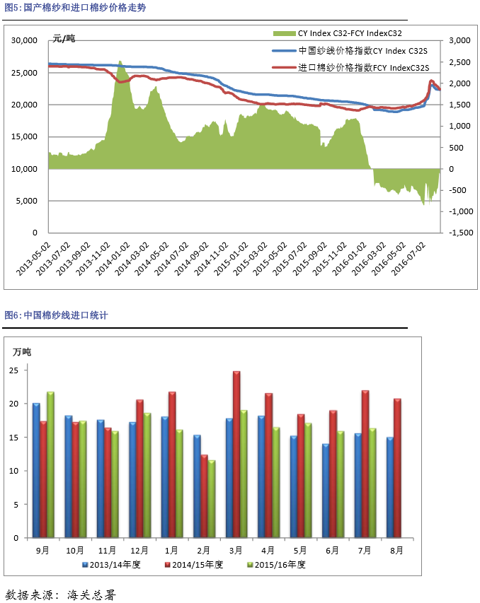 隨著國內(nèi)外棉價(jià)差減小,我們預(yù)計(jì)進(jìn)口棉紗的優(yōu)勢(shì)將逐步減弱,我們?nèi)匀煌茰y2016年我國棉紗進(jìn)口量將在150-190萬噸之間。