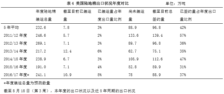 8月新的棉花年度開始,上年度的簽約量結(jié)轉(zhuǎn)到2016/17年度,由于之前印度和巴基斯坦大量缺棉花,美棉價(jià)格高漲,簽約情況和裝運(yùn)情況較好。截止8月18日一周,美國累計(jì)簽約2016/17年度陸地棉88.88萬噸,同比增加48.31%,裝運(yùn)10.91萬噸,美陸地棉的簽約進(jìn)度為37%,5年平均值為42%,裝運(yùn)進(jìn)度為5%,5年平均值為3%。美棉的最大簽約國仍然是越南,但是8月18日一周,之前采購量最大的國家——中國在消沉了兩年之后,采購量大增,對(duì)于美棉來說是一個(gè)較好的預(yù)期,但是后期情況如何還有待觀察,畢竟中國本年度新疆產(chǎn)的棉花質(zhì)量也非常好,兵團(tuán)的棉花質(zhì)量不差于美棉,對(duì)美棉的銷售形成了較大影響。
