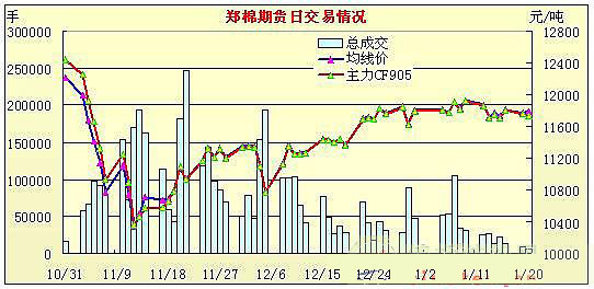 p; 1月20日,鄭棉905合約高開低走,午盤收于11730,最高11760,最低11720,小幅下跌0.17%?,F(xiàn)貨市場上,春節(jié)前收儲暫停進(jìn)行。