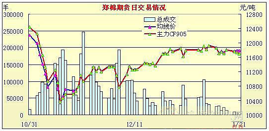 1月21日,鄭棉主力合約CF905低開,早盤在空頭回補(bǔ)推動(dòng)期價(jià)反彈后在多頭平倉打壓下調(diào)整,此后窄幅整理,日線形成陽線星,日線形成陽線星,主要合約成交量萎縮,持倉量減少。C905合約日成交6086手,日減倉1406手,終盤持倉量41062手;CF907合約日成交348手,日減倉22手,終盤持倉量6038;CF909合約日成交1298手,日減倉680手,終盤持倉量5752手。