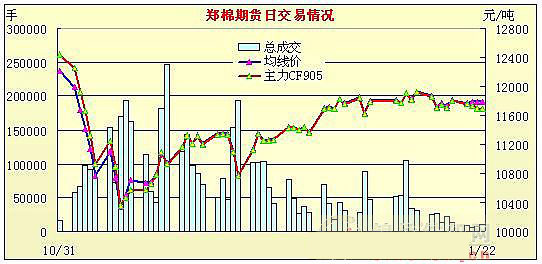 ; 1月22日,鄭棉主力合約0905高開35點,但開盤后價格遍一路下跌,隨后反彈至開盤價11730點,再無上漲力度,價格又回落大幅下跌至最低點11675,午盤收于11700點,上漲5點,漲幅0.04%。春節(jié)前期市場觀望氣氛濃厚,今日成交量、持倉量繼續(xù)萎縮減少。盤面上,從日K線圖看,期價已經(jīng)跌破短期均線的支撐,30日均線承受很大的支撐力度,期價重心下移;MACD指標中綠柱繼續(xù)加長,空頭排列趨勢增長。節(jié)前,很多 紡織企業(yè)提前放假,收儲也因互聯(lián)網(wǎng)惡意攻擊而暫停,短期內(nèi)預計沒有太大的上漲空間,阻力依舊在12000元一線,支撐為11600元一線,短期內(nèi)期價仍將會在11500-12000之間震蕩盤整。