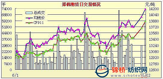 10月12日,鄭棉CF1001合約大幅高開,早盤在多頭買盤推動下沖高,盤中高位盤整,午后略有調整,日線形成高開長陽線,主要合約成交量放大,持倉量大幅增加。CF1001合約日成交46592手,日增倉9108手,終盤持倉量50528手;CF1005合約日成交11144手,日增倉3682手,終盤持倉量16362手。基本面情況:當前國內現貨市場皮棉價格上漲迅速,部分地區(qū)紡織企業(yè)開始初步觀望,但一些簽定委托收購加工的紡織企業(yè)對價格的上漲表現淡定。由于目前棉農看漲持棉觀望的比較多,籽棉交售不積極,收購量和加工量普遍不高,但成交活躍。當前多數棉花經濟人、軋花廠、 棉商、棉農一條線都在囤積棉花賭后市,紡織廠有點犯難,對于快速上漲的棉價較難招架。業(yè)內不少人士預估棉花價格未來將漲致15000元/噸。