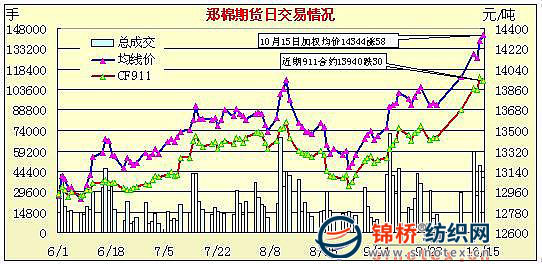 10月15日,鄭棉CF1001合約高開,早盤反復(fù)震蕩,午間增量下滑,尾盤在多頭平倉的壓力下創(chuàng)日低后反彈,日線形成高開陰線,主要合約成交量萎縮,持倉量先增后減。CF1001合約日成交28672手,日減倉58手,終盤持倉量53062手;CF1005合約日成交11172手,日增倉1978手,終盤持倉量22806手?;久媲闆r:現(xiàn)貨受籽棉成本催動及電子盤上漲帶動,三級棉到廠已普遍漲至13600元/噸。弱三好四普遍成交價在13300-13500元/噸左右。棉花企業(yè)、中間商囤棉惜售較多,紡織廠采購困難。北方地區(qū)收購仍未上量,也是籽棉價格高走的原因之一。收購成本上漲,導(dǎo)致皮棉成本較高,部分加工廠降低收購量,邊收邊觀望。
