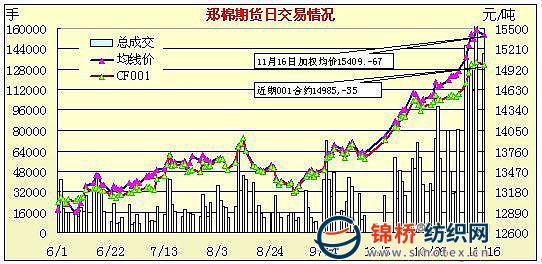 11月16日,鄭棉主要合約CF1001、CF1005合約高開,CF1005合約早盤下探回升,此后橫向盤整,午后一度沖高,但受到空頭賣盤打壓增量下滑,終盤收于日內(nèi)相對低位,日線形成高開小陰線,主要合約成交量萎縮,持倉量增加。CF1001合約日成交5000手,日減倉1252手,終盤持倉量30170手;CF1005合約日成交128722手,日增倉5656手,終盤持倉量141540手?;久媲闆r:北方地區(qū)受雨雪影響,交通運輸仍受到阻礙,購銷仍基本處于停滯。湖北、山西、陜西、新疆等地區(qū)籽棉收購接近尾聲,尾期花質(zhì)量下降,但收購仍很難上量,好級籽棉價格仍有所上漲。棉籽、棉短絨價格上漲勢頭不減,山東棉籽最高價已突破1.5元/斤。湖北地區(qū)棉花質(zhì)量較好,基本能達到三級,棉企選擇做倉單的較多。截止日前,大部分棉花企業(yè)仍囤棉待漲,紡織企業(yè)采購困難,熱切期待國家拋儲。
