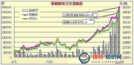 11月25日,鄭棉CF1005合約小幅高開,早盤沖高后在空頭賣盤打壓下回落,隨后區(qū)間盤整,午后快速下滑測試短線支撐位反彈,交投重心較午前下移整理,尾盤在空頭回補的支撐下反彈,日線形成陰線,主要合約成交量再創(chuàng)新高,持倉大量增加。CF1001合約日成交6470手,日減倉838手,終盤持倉量22986手;CF1005合約日成交501842手,日增倉18788手,終盤持倉量203128手?;久媲闆r:紡企、棉商都大幅上調(diào)了采購價格。山東某大型紡企三級棉調(diào)到15000元/噸,湖北某大型棉商三級棉調(diào)到了14970元/噸。現(xiàn)貨價格猛漲,激起了加工廠收購熱情,籽棉收購進度加快,價格續(xù)漲,但后期花質(zhì)量較差,多為四、五級。另據(jù)調(diào)查,目前新疆大部分加工廠都仍在收購,籽棉價格較前期上調(diào),在6.2-6.6元/公斤,收購上的籽花等級質(zhì)量下降,主要為三、四級,多數(shù)棉企囤棉未售。 |