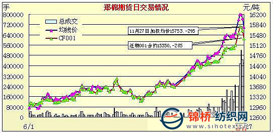 11月27日,鄭棉CF1005合約延續(xù)昨日下滑動(dòng)能低開(kāi),早盤反抽回落并形成平臺(tái)盤整,午后多頭平倉(cāng)盤打壓期價(jià)下滑,盤中觸及跌停價(jià)位后反彈,日線形1/2下影線的陰線,主要合約成交量較前一日下滑,持倉(cāng)量大減。CF1001合約日成交5892手,日減倉(cāng)440手,終盤持倉(cāng)量21430手;CF1005合約日成交396914手,日減倉(cāng)25638手,終盤持倉(cāng)量181120手?;久媲闆r:現(xiàn)貨價(jià)格表現(xiàn)堅(jiān)挺,維持平穩(wěn)小漲,成交價(jià)在15200-15500元/噸左右。籽棉收購(gòu)價(jià)格繼續(xù)上漲,棉農(nóng)銷售積極性上升,收購(gòu)量提高。棉花企業(yè)囤棉信心開(kāi)始松動(dòng),部分棉企開(kāi)始打算逐步適價(jià)銷售庫(kù)存,現(xiàn)貨成交增加。大多數(shù)企業(yè)恐配額突然下發(fā),表現(xiàn)不一。棉花企業(yè)擔(dān)心配額下發(fā)后現(xiàn)貨價(jià)格大跌,紡織企業(yè)擔(dān)心高價(jià)買完棉花后配額下發(fā)。市場(chǎng)整體保持觀望心態(tài),紡企主要采購(gòu)精力集中在拋儲(chǔ),價(jià)格合適則適量購(gòu)買。