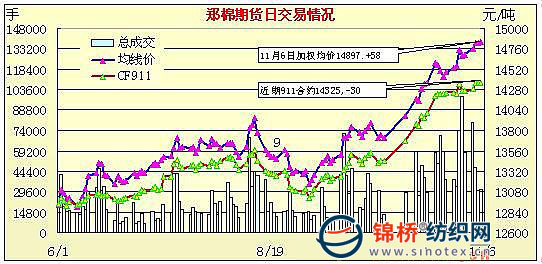 11月6日,鄭棉主要合約CF1001、CF1005合約低開,早盤在多頭買盤推動下回穩(wěn),午前增倉上行,午后重心上移,尾盤上試日高后調(diào)整,日線形成陽線,主要合約成交量放大,CF1005合約持倉量大幅增加。CF1001合約日成交14310手,日減倉620手,終盤持倉量40842手;CF1005合約日成交65454手,日增倉12710手,終盤持倉量74498手?;久媲闆r:現(xiàn)貨價格基本保持穩(wěn)定,漲幅不大,紡織廠面對持續(xù)上漲的棉價似乎已經(jīng)見怪不怪了,棉花價格高就少用棉花,庫存量自然也是維持較低。由于近期棉副產(chǎn)品價格堅挺,尤其以棉籽為代表,所以不少軋花廠已經(jīng)開始囤積棉籽。 籽棉價格仍在上漲,山東濱州地區(qū)籽棉收購價高達3.6元/斤,其他棉區(qū)的籽棉價格也有小幅上漲,但是收購量有所下降,一些在農(nóng)發(fā)行貸款的企業(yè)大多已經(jīng)停收了,同時由于擔(dān)心后市風(fēng)險,不少企業(yè)加緊銷售手中的棉花。