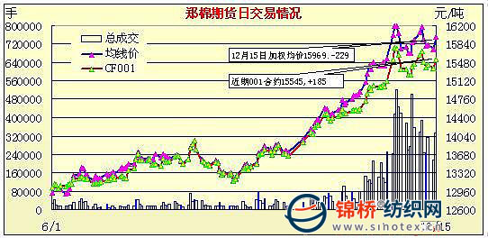 12月15日,鄭棉CF1005合約高開,早盤上沖后橫盤整理,盤中大量換手增量,午后在多頭買盤推動下沖高,日線形成高開陽線,主要合約成交量放大,持倉量大幅回升。CF1001合約日成交926手,日減倉92手,終盤持倉量16030手;CF1005合約日成交309176手,日增倉25162手,終盤持倉量214232手?;久媲闆r:國家發(fā)展改革委經(jīng)貿(mào)司副司長劉曉楠近日指出,預(yù)計(jì)2009年棉花產(chǎn)量較上年下降100萬噸左右,國家除了通過拋儲調(diào)控市場缺口外,發(fā)放配額也調(diào)控的另一手段,目前配額問題已上報(bào)國務(wù)院并審批通過,近期即將發(fā)放,國家有能力保證足夠的數(shù)量滿足紡織用棉。近期安徽地區(qū)持續(xù)降雨,嚴(yán)重地影響了尾花質(zhì)量,而且因籽棉含水過高給收購加工帶來不便?;久媲闆r:周末12月12日全國棉花交易市場成立十周年慶典上,國家發(fā)展改革委經(jīng)貿(mào)司副司長劉曉楠在會上發(fā)言時(shí)指出,預(yù)計(jì)2009年棉花產(chǎn)量較上年下降100萬噸左右,國家除了通過拋儲調(diào)控市場缺口外,發(fā)放配額也調(diào)控的另一手段,目前配額問題已上報(bào)國務(wù)院并審批通過,近期即將發(fā)放,國家有能力保證足夠的數(shù)量滿足紡織用棉。近期安徽地區(qū)持續(xù)降雨,嚴(yán)重地影響了尾花質(zhì)量,而且因籽棉含水過高給收購加工帶來不便。
