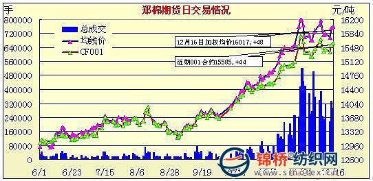 12月16日,鄭棉CF1005合約低開,早盤震蕩下探后在多頭買盤推動下沖擊日高,隨后在平倉盤壓制下回落盤整,日線形成低開星線,主要合約成交量萎縮,持倉量增加。CF1001合約日成交2832手,日減倉2294手,終盤持倉量13656手;CF1005合約日成交279316手,日增倉3118手,終盤持倉量217350手?;久媲闆r:現(xiàn)貨價格維持平穩(wěn),個別成交價格略有下調(diào)。受年底臨近,配額發(fā)放日期臨近影響,紡織企業(yè)購買現(xiàn)貨趨緩,整體觀望氣氛較濃?,F(xiàn)貨價格好三級穩(wěn)定在15000元/噸左右,弱三級在14800元/噸左右。棉商出貨意愿有所增強,但成交仍一般。籽棉收購進入尾聲,價格有所回落。