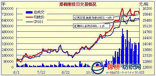 12月23日,鄭棉CF1005合約低開(kāi),早盤在空頭賣盤打壓下波段走低,午前創(chuàng)日低后在空頭回補(bǔ)的支撐下脫離低點(diǎn)反彈盤整,尾盤多頭平倉(cāng)壓制期價(jià)收弱,日線形成低開(kāi)陰線,主要合約成交量萎縮,持倉(cāng)量小幅增加。CF1005合約日成交266798手,日增倉(cāng)6244手,終盤持倉(cāng)量199664手;CF1009合約日成交30922手,日減倉(cāng)3430手,終盤持倉(cāng)量23074手?;久媲闆r:山東某大型紡企提高皮棉到廠價(jià)格,突顯廣收資源態(tài)勢(shì)。棉花加工廠出貨轉(zhuǎn)為積極,大小廠均銷售意愿增強(qiáng)。紡織廠庫(kù)存較低,進(jìn)貨積極。也有部分紡織廠由于原料價(jià)格過(guò)高,開(kāi)始限產(chǎn)或減產(chǎn)。據(jù)紡企反映,今日新疆站臺(tái)價(jià)14630元/噸有大量簽約。雖然有消息稱配額已經(jīng)下發(fā),但市場(chǎng)價(jià)格不降,反有上升趨勢(shì)。