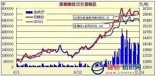 12月24日,鄭棉CF1005合約高開,早盤在空頭賣盤打壓下創(chuàng)日低,隨后空頭回補(bǔ)與多頭低位承接買盤推動(dòng)期價(jià)回升,此后高位震蕩,日線形成高開陽(yáng)線星,主要合約成交量變化不大,持倉(cāng)量大幅減少。CF1005合約日成交254274手,日減倉(cāng)10368手,終盤持倉(cāng)量189296手;CF1009合約日成交30120手,日減倉(cāng)3632手,終盤持倉(cāng)量26706手?;久媲闆r:現(xiàn)貨價(jià)格維持平穩(wěn)。臨近年底,棉企、棉商為還貸款出貨增多,市場(chǎng)成交升溫。據(jù)紡企反映,放在保稅庫(kù)的棉花在發(fā)往各個(gè)分廠,數(shù)量不多,似乎一個(gè)工廠也只能分到140噸左右。新疆棉花的價(jià)格有所微跌,23日毛重三級(jí)站臺(tái)提貨價(jià)14600元/噸交貨,較昨日跌30元/噸。