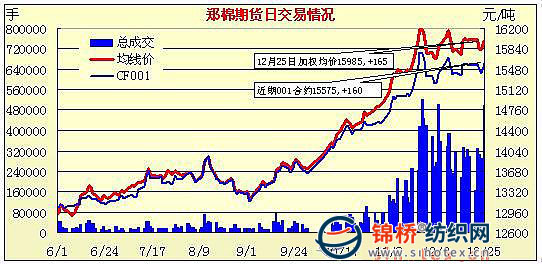 12月25日,鄭棉CF1005合約小幅低開,早盤下探回穩(wěn),隨后多頭集中放量拉升期價(jià)走高,此后高位盤整,午后沖擊日高,尾盤在周末多頭平倉的壓制下略有回落,日線形成陽線,主要合約成交量放大,持倉量大幅增加。CF1005合約日成交444320手,日增倉28362手,終盤持倉量217658手;CF1009合約日成交47268手,日增倉4544手,終盤持倉量31250手?;久媲闆r:部分紡織企業(yè)反饋,已經(jīng)拿到部分配額,但是為1%滑準(zhǔn)稅的,數(shù)量較少,而且多數(shù)為加工貿(mào)易配額。棉花企業(yè)出貨意愿明顯增強(qiáng),紡織企業(yè)則購買現(xiàn)貨意愿放緩,以觀望為主。據(jù)了解,新疆棉運(yùn)輸質(zhì)押在站臺嚴(yán)重,今日兵團(tuán)棉花放在沿海各大倉庫的帶款提貨價(jià)15400元/噸。