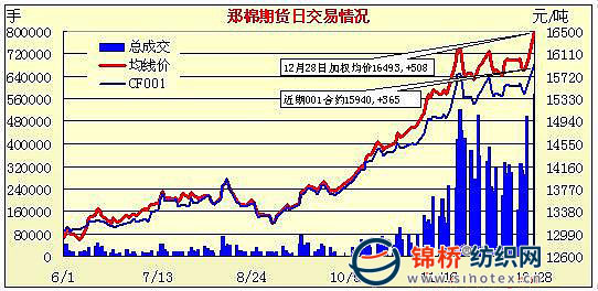 12月28日,鄭棉CF1005合約小幅高開,早盤在多頭買盤推動下沖高,午前于前期高點(diǎn)一線盤整震蕩,午后走高收于漲停,日線形成長陽線,主要合約成交量放大,持倉量大幅增加。CF1005合約日成交503838手,日增倉67330手,終盤持倉量284988手;CF1009合約日成交58812手,日增倉10988手,終盤持倉量42238手。基本面情況:大部分申請配額的紡織企業(yè)已經(jīng)知道配額數(shù)量,配額證紡企預(yù)計下周將拿到。但本次下發(fā)的配額中,增發(fā)的100萬噸配額多為加工貿(mào)易,多數(shù)紡織企業(yè)期望盡快拿到滑準(zhǔn)稅配額。另外,據(jù)新疆地區(qū)棉企反映,目前新疆火車站站臺上已經(jīng)堆滿新疆棉,運(yùn)往內(nèi)地困難程度加劇,并且這幾天又遇降溫降雪天氣,運(yùn)輸難度加大。大部分人士預(yù)測,如果新疆棉運(yùn)輸問題不得以解決,即使配額發(fā)下來,后期內(nèi)地棉價也將趨于上漲。